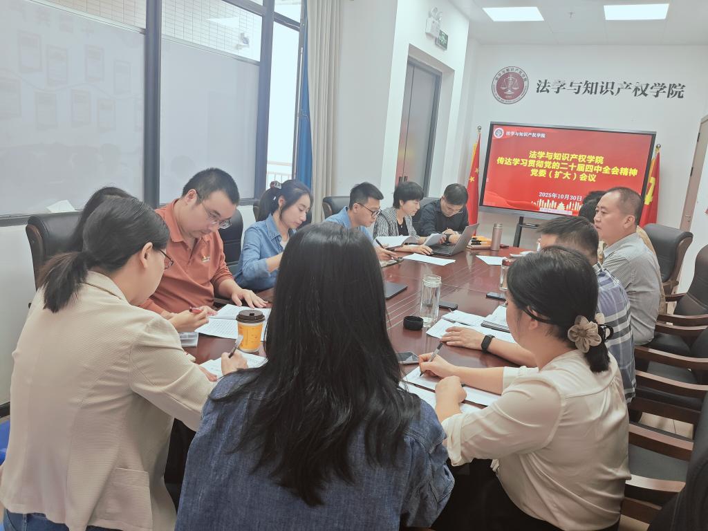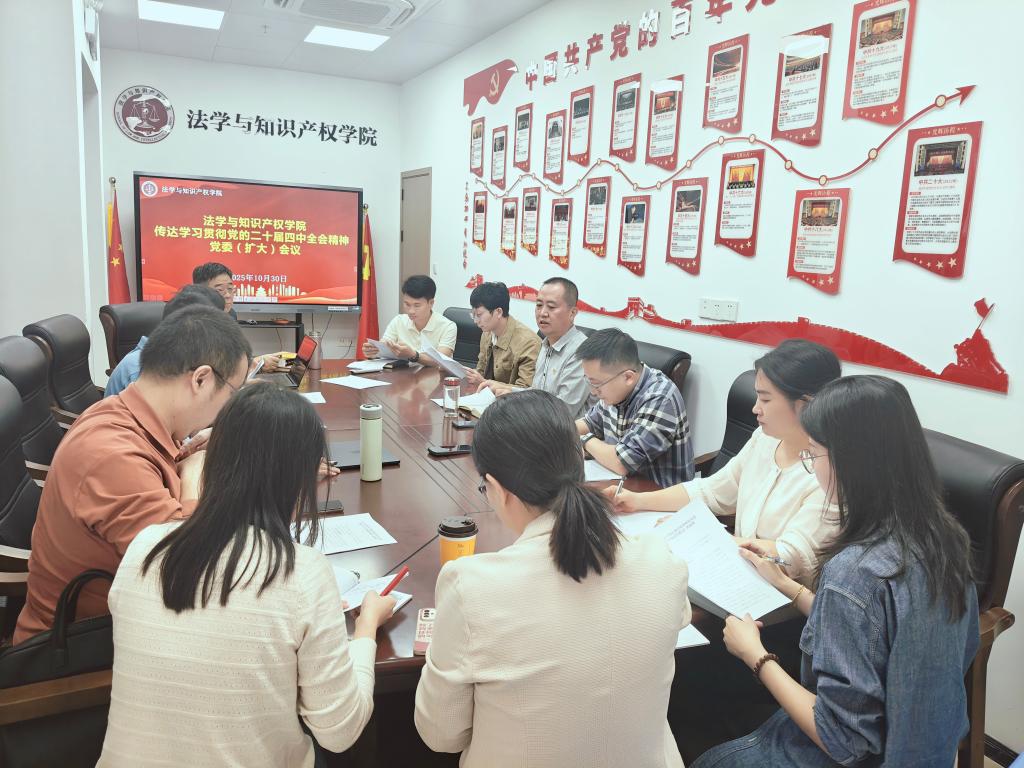 10月30日,法学与知识产权学院召开党委(扩大)会议,专题传达学习习近平总书记在党的二十届四中全会上的重要讲话和全会精神。学院全体党委委员、党支部书记、系主任、专业负责人和政工干部参加会议。会议由学院委书记许建鑫主持。