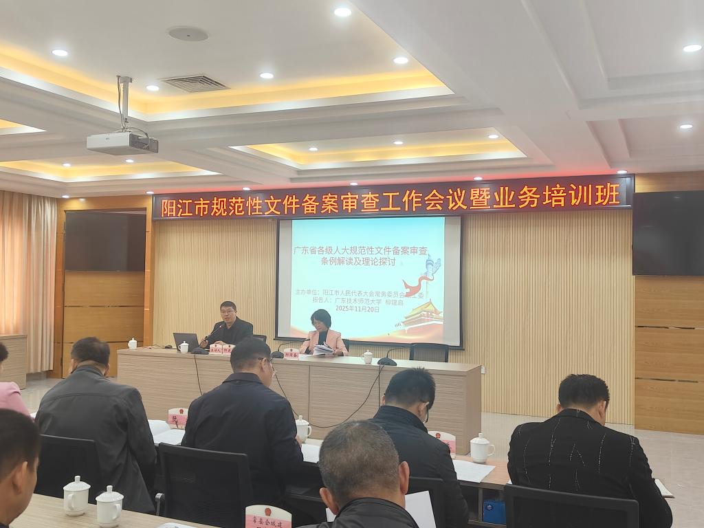 11月20日,阳江市人大常委会召开全市规范性文件备案审查工作会议暨举办业务培训班,阳江市人大常委会副主任冯周海参加会议并讲话。我院地方立法研究中心主任、副教授柳建启受邀请参加会议,并作《广东省各级人大规范性文件备案审查条例解读及理论探讨》专题授课。