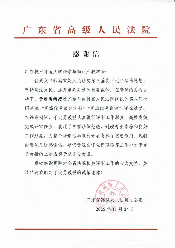 近日,法学与知识产权学院收到广东省高级人民法院感谢信,副教授于定勇参与最高人民法院组织开展的第八届全国法院“百篇优秀裁判文书”“百场优秀庭审”评选活动。在担任评委期间,于定勇认真履行评审职责,高质高效完成评审任务,展现了我院教师丰富法律经验、过硬专业素养和良好工作形象,受到了广东省高级人民法院的肯定和表扬。