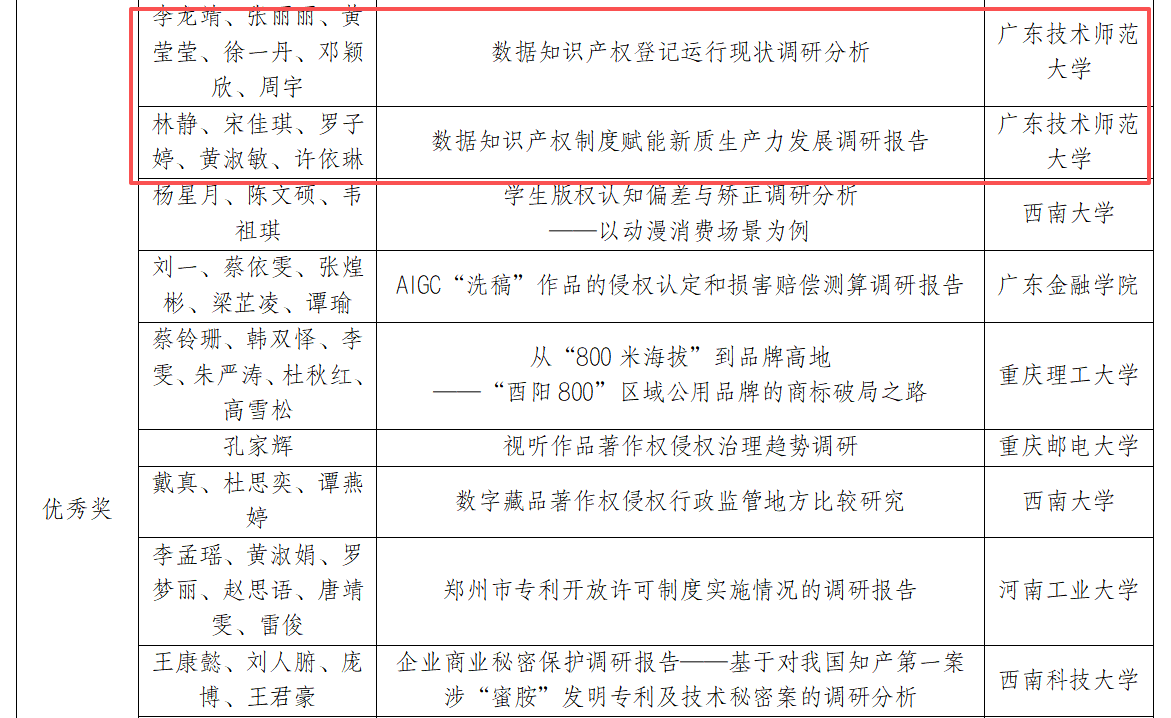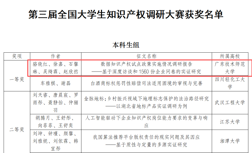 全国大学生知识产权调研大赛旨在鼓励学生围绕“加强知识产权保护,助推知识产权强国建设”为主题开展调研,提高大学生社会调查能力和知识产权保护的热情,塑造尊重知识、崇尚创新、诚信守法、公平竞争的知识产权文化理念,为知识产权强国建设献计献策并提供数据支撑。通过参与本次大赛,不仅锻炼了我校学生的社会调查能力和知识产权实践应用能力,也充分展示了我校学生的优秀素养和良好形象,更有力彰显了我校知识产权专业建设和人才培养的成效。我院将继续秉承“厚基础、重实践、求创新”的人才培养理念,加强高素质应用型法治人才和知识产权人才培养。