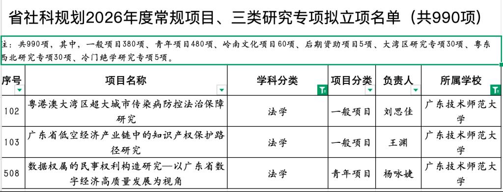 近日,广东省哲学社会科学规划2026年度常规项目及三类研究专项拟立项名单正式公示,我院法学学科再创佳绩。王渊、刘思佳、杨咏婕三位教师申报的项目成功获批立项,涵盖一般项目与青年项目,充分展现我院教师扎实的科研实力与前沿的学术视野。